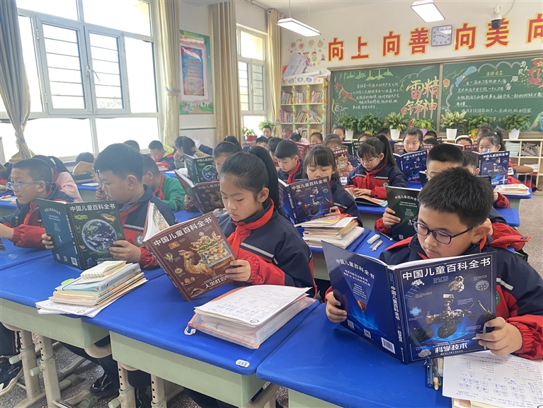图为市二中的学生在阅读《中国儿童百科全书》。