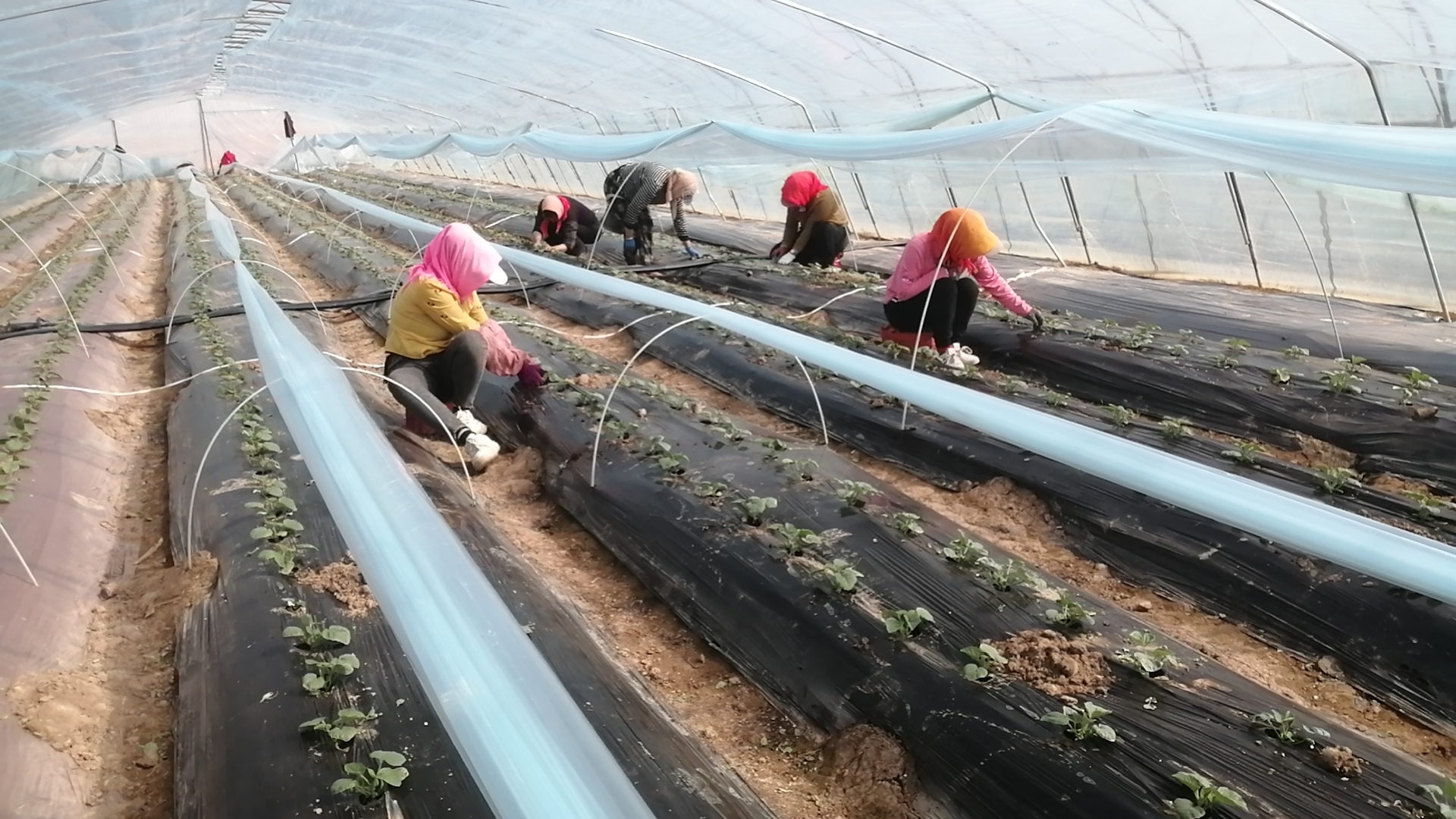 磴口县隆盛合镇民兴村产业园区的工人在大棚里栽植香瓜苗