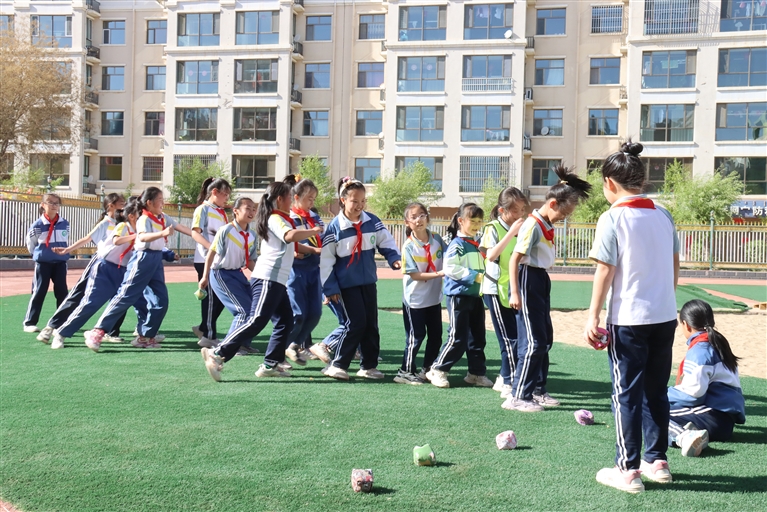 图为临河二小学生在大课间玩游戏。
