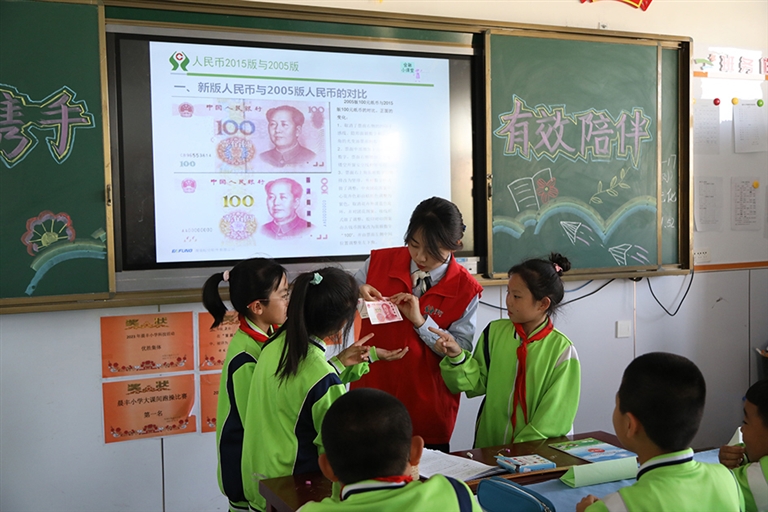 近日,陕坝农商银行五星支行积极开展金融知识进校园、进老年大学诚信主题活动,普及金融知识,让诚信文化扎实落地,营造守信互信、共践共行的良好氛围。图为该行工作人员向杭锦后旗晨丰小学学生讲解不同面额人民币所具有的元素、特点,通过对比真假人民币,引导孩子们学会正确识别人民币。