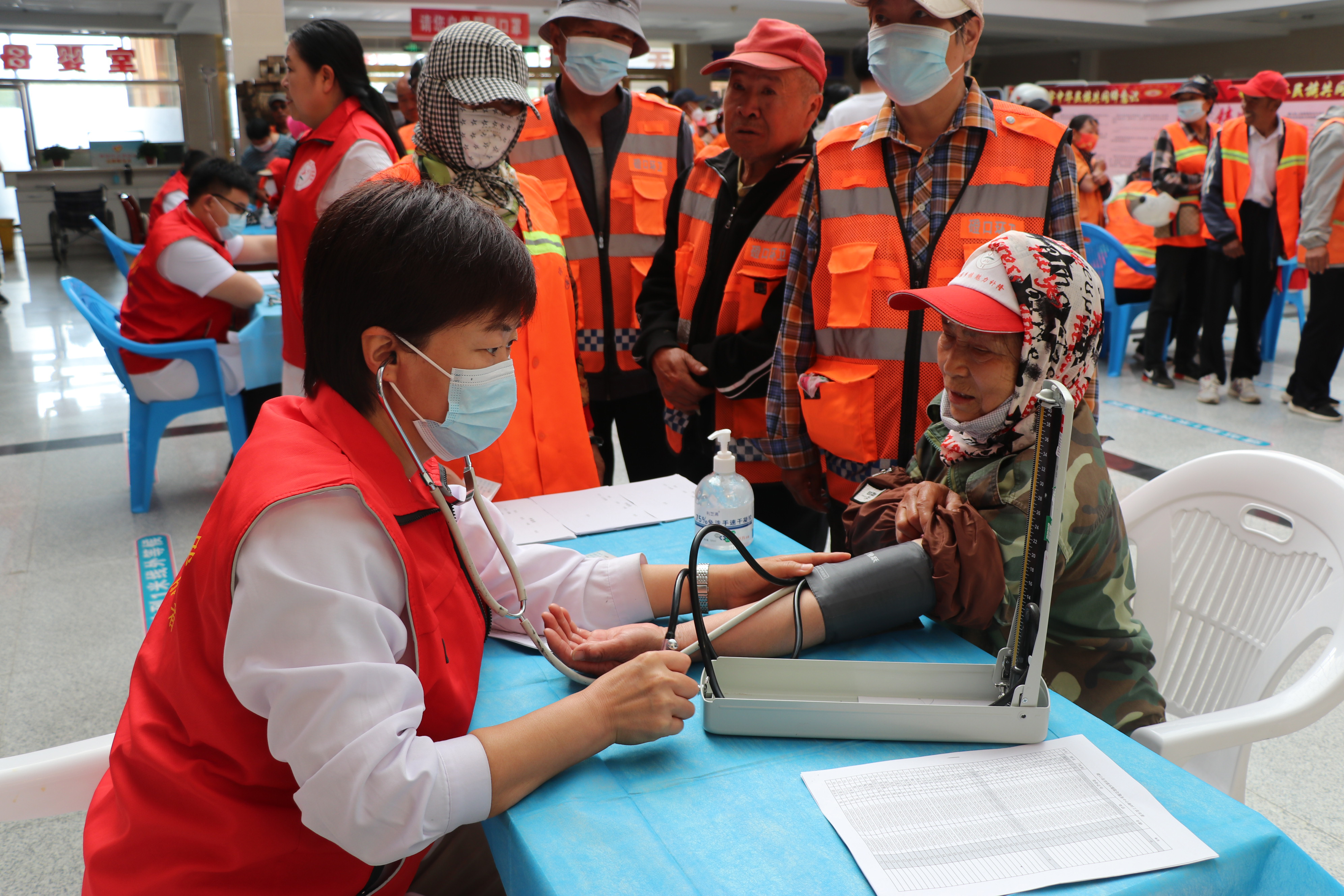 5月25日上午,磴口县人民医院党员服务队在门诊大厅为200余名环卫工人免费体检,并提供健康指导、普及用药知识等,使环卫工人了解自身的健康状况,感受到社会的关爱。