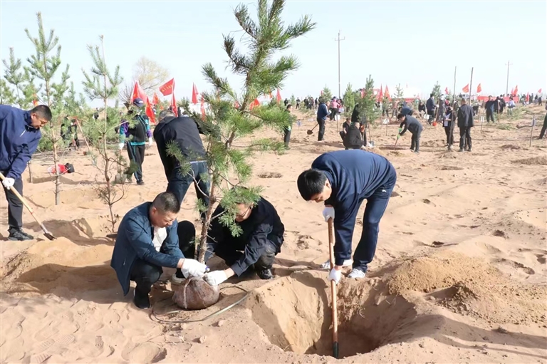 杭锦后旗依托“三北”工程六期,按照“全要素一体化”保护治理模式,推行“工程固沙+经济林+湿地保护修复+沙漠旅游+农民利益联结+龙头企业带动产业发展”治理模式,打造乌兰布和沙漠综合治理示范区,努力将治理区打造成防沙治沙高质量发展样板区。截至目前,杭锦后旗已完成风电光伏一体化治理固沙2.7万亩。旗林草局副局长段光硕说:“‘三北’工程六期黄河‘几字弯’工程中,杭锦后旗2024年有1.8万亩的工程固沙和1.82万亩的人工造林任务。截至5月末,我们已经完成了1.8万亩的工程固沙、1.7万亩的沙生灌木造林。”