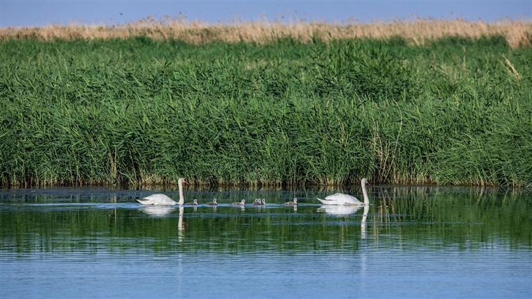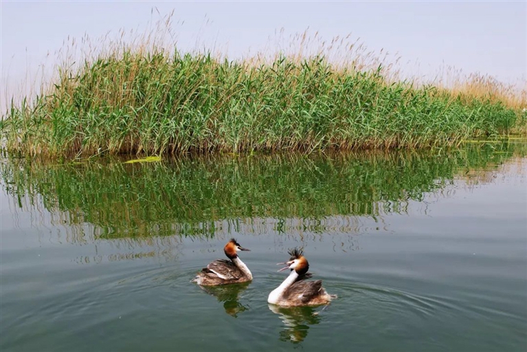 对于许多鸟类而言,清澈的河湖胜似天堂,比如一张大嘴夹万物的鹈鹕,比如能在浅水中长时间站立不动的苍鹭,又比如栖息于湖泊、沼泽和河流附近,繁殖于崖壁或者高树上的黑鹳。天气晴好、水波不兴时,为父为母的疣鼻天鹅、灰雁、凤头鸊鷉等还会带着它们可爱的宝宝在水面上游玩,场面温馨又有爱。