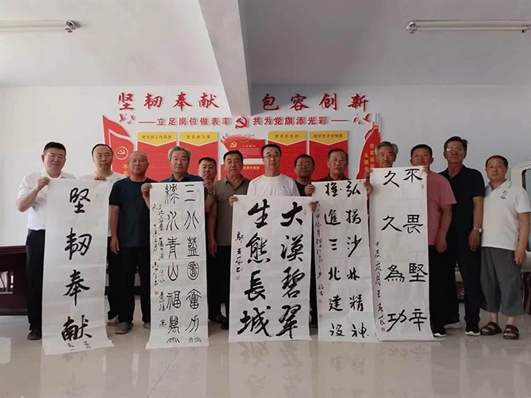 会后,两级老年书画协会书画家挥毫泼墨,尽情书写沙漠人励志奉献、改天换地、改变沙漠生态的伟大精神。