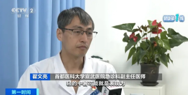 首都医科大学宣武医院急诊科副主任医师 翟文亮:轻症中暑可能表现为头晕、头疼、恶心、呕吐、乏力;重症中暑会有一些神经系统表现,比如嗜睡、昏睡、昏迷、肌肉强烈痉挛发作。