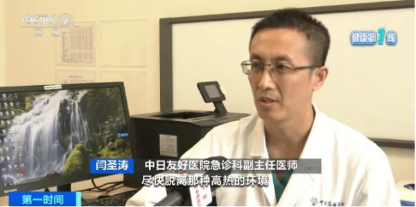 中日友好医院急诊科副主任医师 闫圣涛:尽快脱离高热环境,先把病人转移到通风的地方,要尽快给病人补充水分以及矿物质。