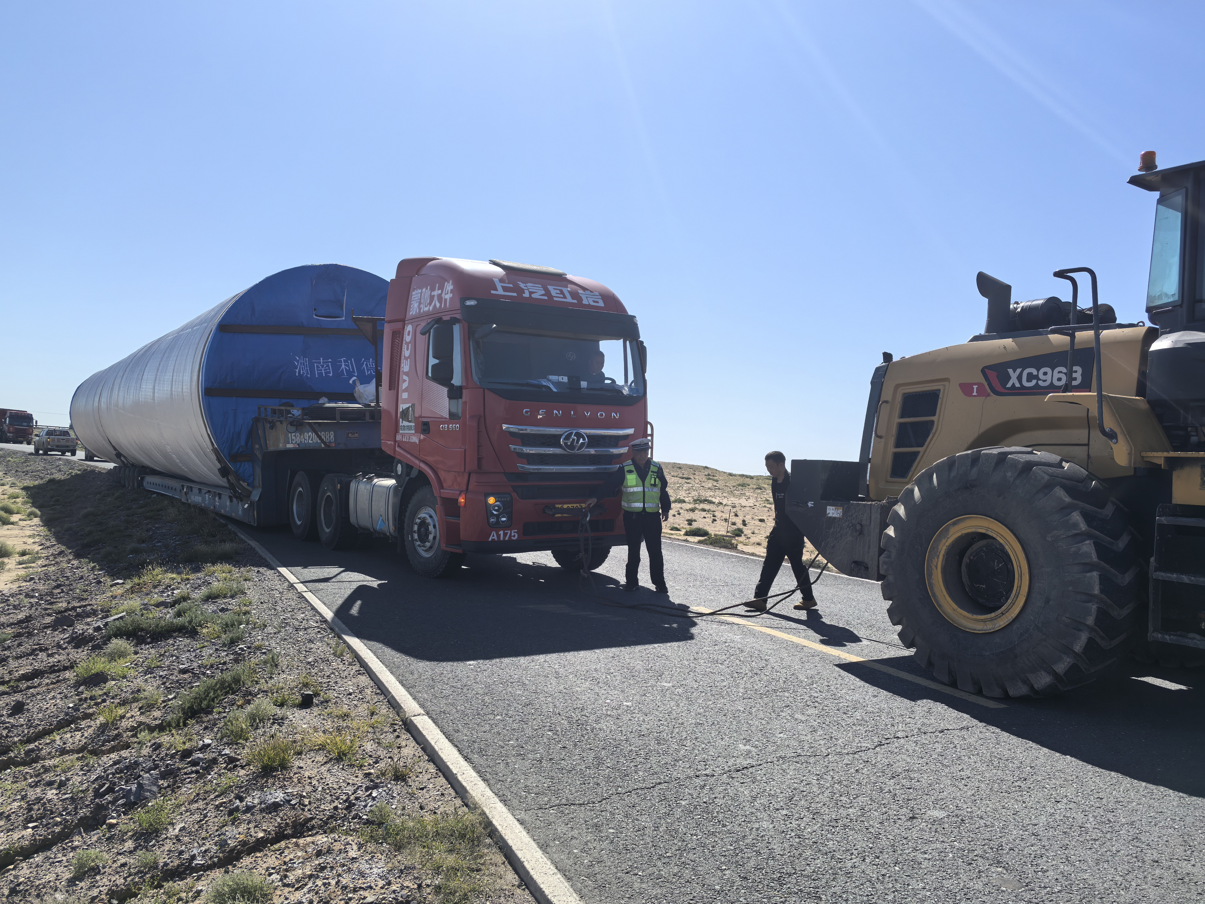 9月25日,甘其毛都交管大队民警帮一辆陷入路沟大件物品运输车脱困。