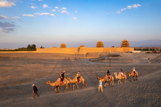7月15日,游客在嘉峪关关城旁骑骆驼游览(无人机照片)。新华社记者郎兵兵 摄
