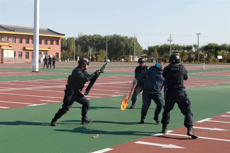 演练中,由“蓝军”模拟的歹徒在巴音宝力格镇商业步行街南侧持刀伤害过路群众,围观群众报警,负责处置的红方民辅警在接到命令后快速到达现场进行封控,在口头警告无效的情况下,立即使用警棍、盾牌等防暴警械与“歹徒”搏斗,最后成功将其控制并带离现场。