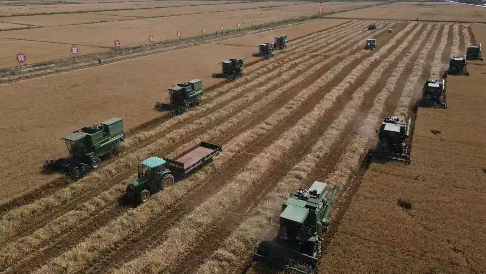 临河区新华镇十万亩高产高效粮食生产示范园区小麦开镰场景(资料图)