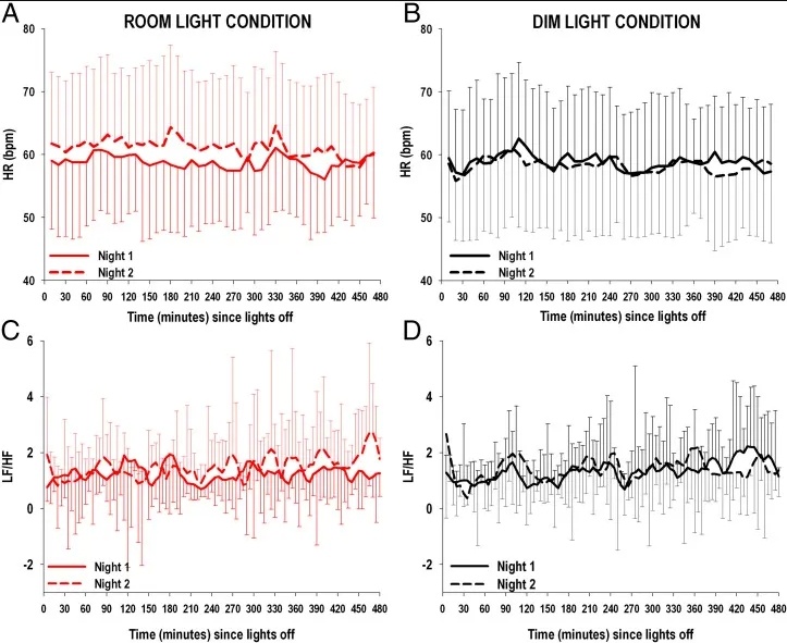 那么,光污染会怎么影响到我们的身体的呢?为了探究这个问题,研究人员把20名参与者分别安排在昏暗的房间以及开灯的房间中入眠,在夜间同步监测他们的心率。