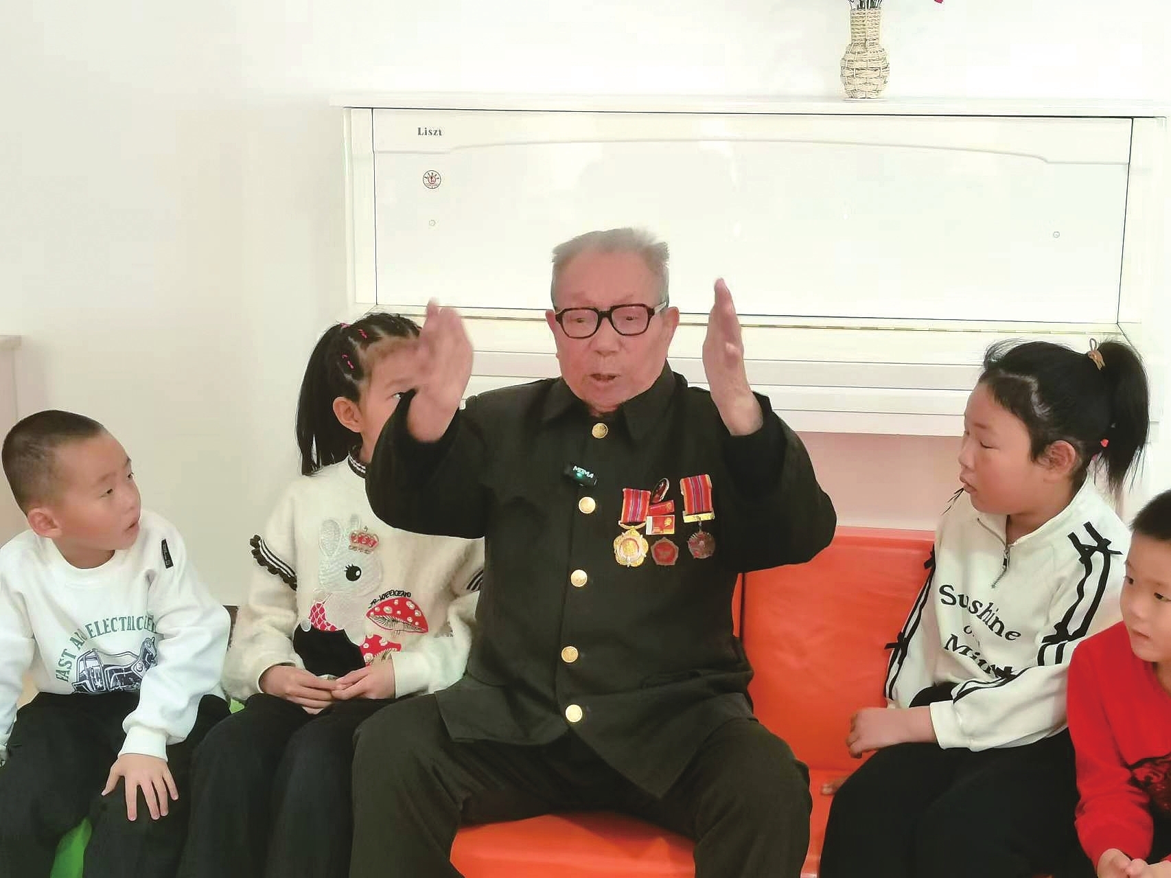 在幼儿园的教室里,小朋友们整齐地坐成一排,眼睛里充满了好奇和期待。老兵志愿者鲁寿昌的胸前挂满了军功章。他用生动形象、通俗易懂的语言,为小朋友们讲述了自己的亲身经历。