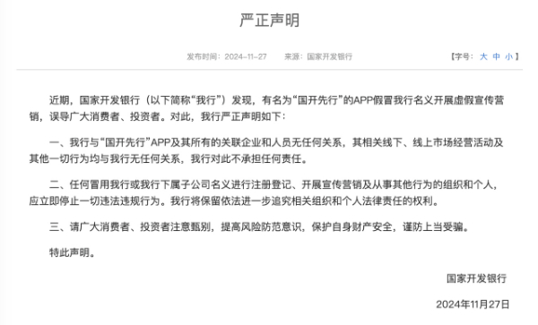 国开行在《声明》中表示,近期,该行发现,有名为“国开先行”的App假冒国开行名义开展虚假宣传营销,误导广大消费者、投资者。对此,国开行严正声明如下: