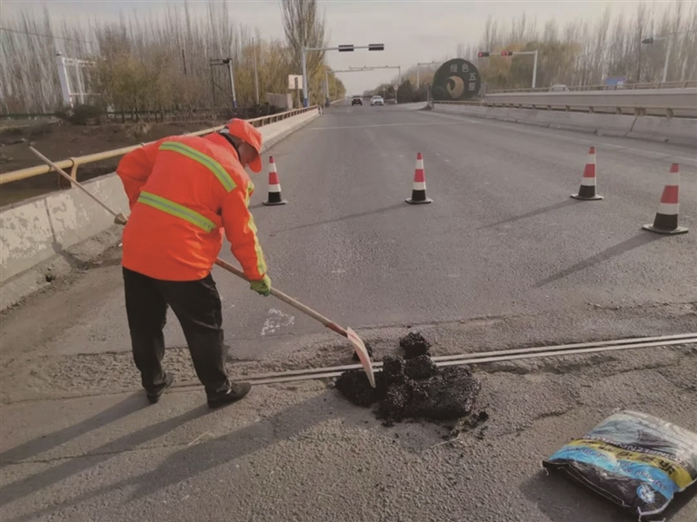 及时修补,消除行车隐患。针对排查中发现的路面坑槽、车辙等公路病害,第一时间根据路面坑槽实际状况制定修复方案,抢抓晴好天气的有利时机,组织人员对路面坑槽进行修补作业,及时消除安全隐患,保障行车安全。