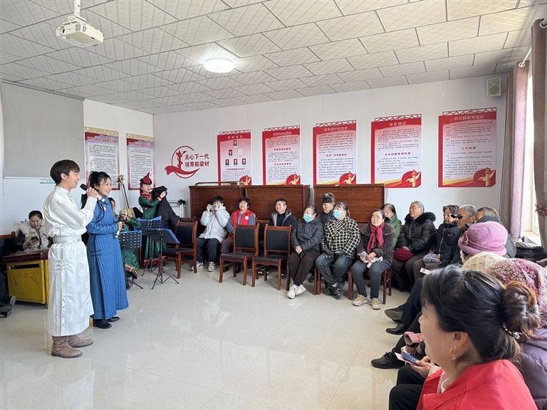 服务活动中,磴口乌兰牧骑通过“宣讲+演出”的方式,讲解了“北疆文化”的深刻内涵和时代意义,大力弘扬和传承蒙古马精神和“三北精神”,引导各族群众牢固树立休戚与共、荣辱与共、生死与共、命运与共的共同体理念。紧接着,马头琴齐奏《追风逐日》、二人台《常青树》等精彩的节目轮番上演,赢得了村民朋友的阵阵掌声。这些主题鲜明、形式多样,粘着泥土、冒着热气的文艺演出,传递着建设北疆亮丽风景线的豪迈激情,让广大群众尽情享受艺术之美,潜移默化中传播了丰富的传统文化知识。期间,乌兰牧骑小分队上门为行动不便的老人带去精彩的文艺表演,在传递温情的同时,助力文明理念深入人心。