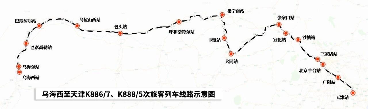 据了解,K886/7、K888/5次列车运行于乌海西至天津间,单程运行里程1298公里,运行时间17小时57分,途经包头、呼和浩特、集宁南、大同、张家口、北京丰台、天津等15个车站。