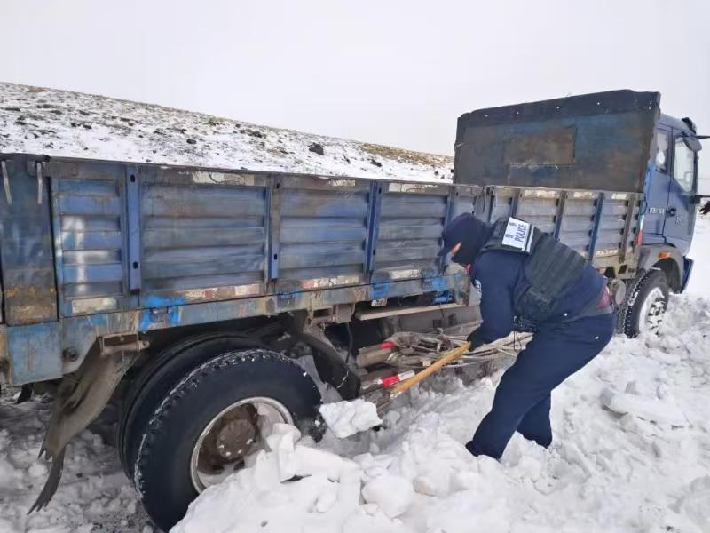 12月12日,乌拉特中旗新忽热苏木普降大雪,新忽热派出所民警巡逻时接到群众报警称,一辆运输车被困雪地,无法动弹。