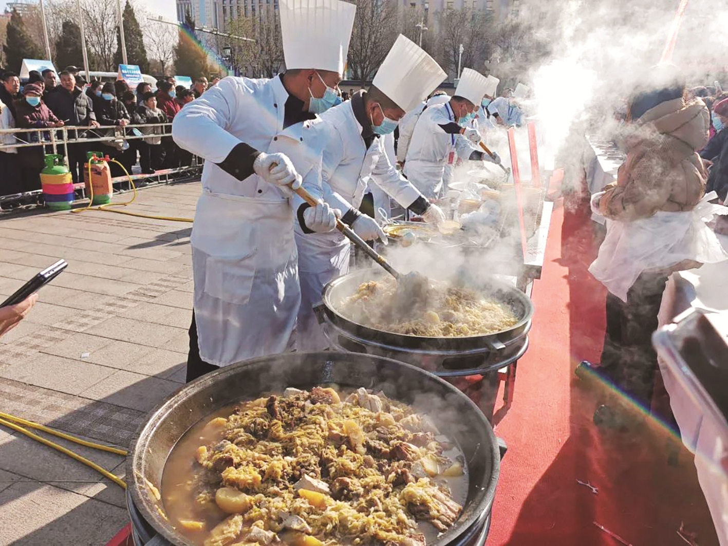11:20黄柿子火锅展示区热气腾腾、香气四溢,河套农副产品展销区琳琅满目的特产让人目不暇接,“猪事宴”展区热闹非凡,猪肉大串更是霸气十足,还有巴彦淖尔“蒸”好等特色美食等你发现。