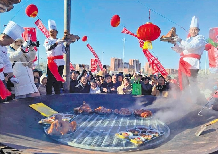 12月21日,巴彦淖尔市杭锦后旗冰雪旅游嘉年华暨第八届年猪文化节火热开启,直径3.3米的“河套第一锅”里热气腾腾,“有头有脸”和河套硬四盘,让众多游客垂涎欲滴。近年来,杭锦后旗持续擦亮文旅品牌,积极搭建冰雪运动、冰雪产业发展平台,充分展示特有的冬季景观和丰富多彩的冬季民俗节庆文化,让冰雪“冷资源”变成旅游“热经济”。草原云·内蒙古新闻网记者 薛来 摄