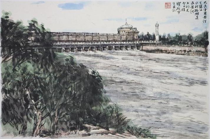 李耀林《三盛公水利枢纽》用色清丽,展现大自然与人类智慧共同铸就的绝美景观。