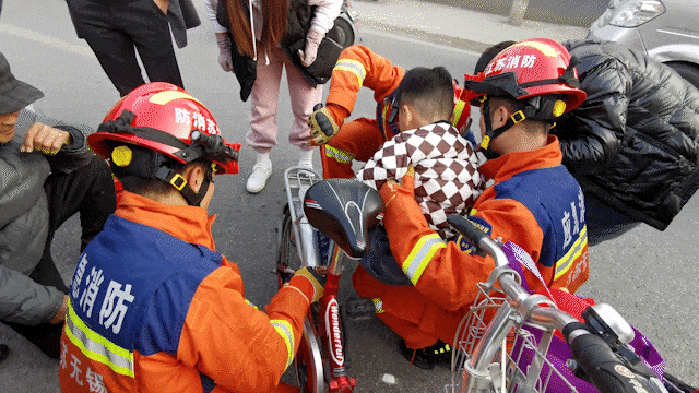 2024年1月13日,无锡滨湖区一名小男孩的左脚被卡在自行车后轮内无法动弹。