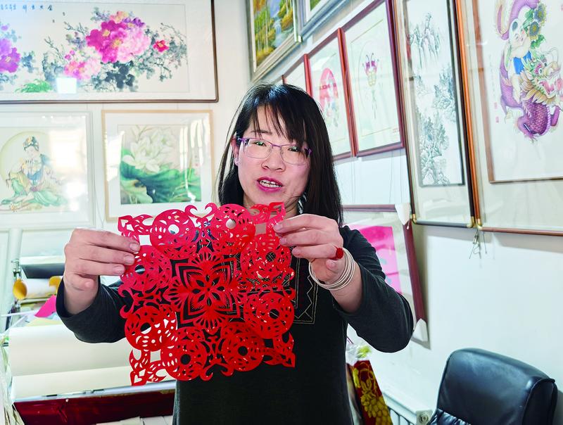 剪刀在手,红纸旋转,我市非遗代表性项目河套年画代表性传承人潘存燕眼神专注,手指灵巧,不一会儿就剪出一张蛇年生肖剪纸作品,生动的图案令人赞叹。