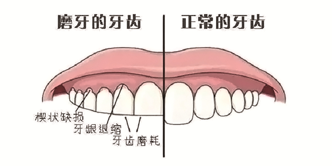 兼有夜磨牙和白天紧咬牙的现象。由于夜磨牙致使牙齿强烈叩击在一起,又没有食物缓和,造成牙齿表面的保护物质过分磨损,使保护物质下面的牙本质暴露出来。轻者对冷、热、酸、甜等刺激食物过敏,重者可导致牙床经常出血、发炎、牙齿松动甚至脱落。