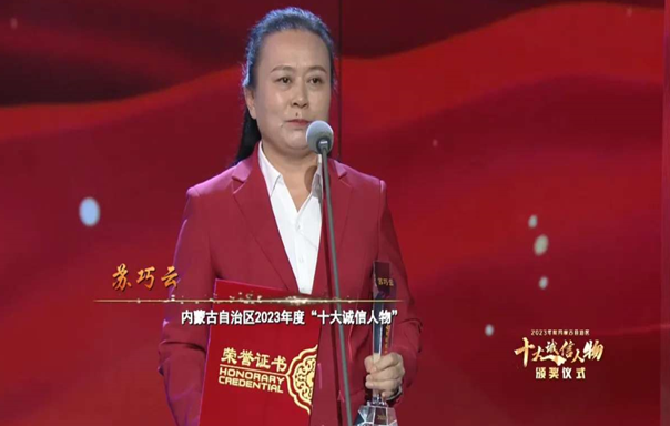 “你把自己的姓氏标记在商品上,这是一份承诺,更是一种自信。这承诺植根于货真价实,这自信源自于诚信经营。大巧如拙,童叟无欺方能行稳致远,大道至简,经商之道自古以诚为先。”这是内蒙古自治区2023 年度“十大诚信人物”评选颁奖仪式上组委会给苏巧云的致敬词,短短的一段话,高度概括了她“诚信做人,诚信做事”的品质。