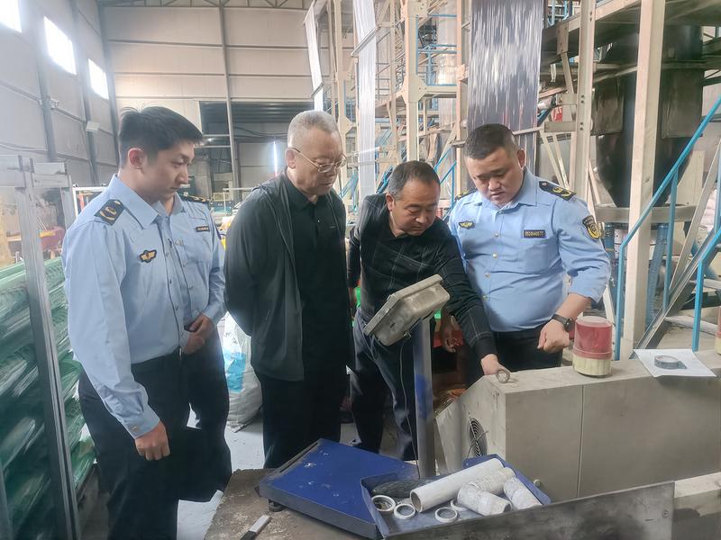 这是5月8日五原县市场监督管理局执法人员检查农用地膜生产企业。