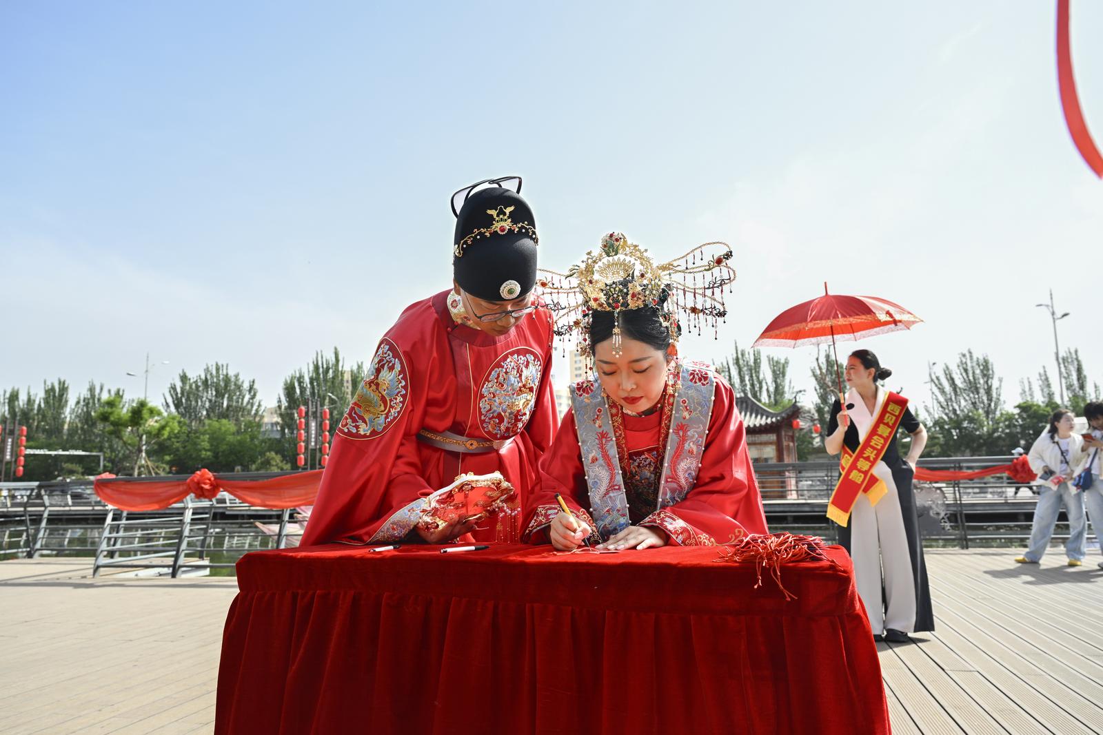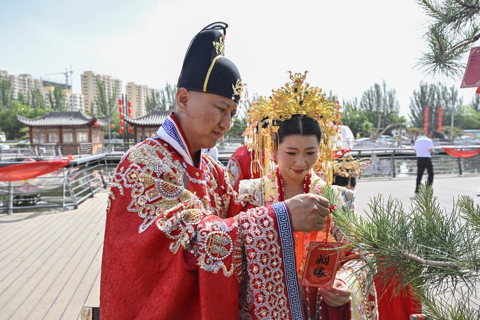 新人闫娟、戴增甜蜜地说:“当我们穿着传统婚服走过红毯,仿佛能感受到历史的温度。这样的婚礼太特别了,既传统又浪漫。”