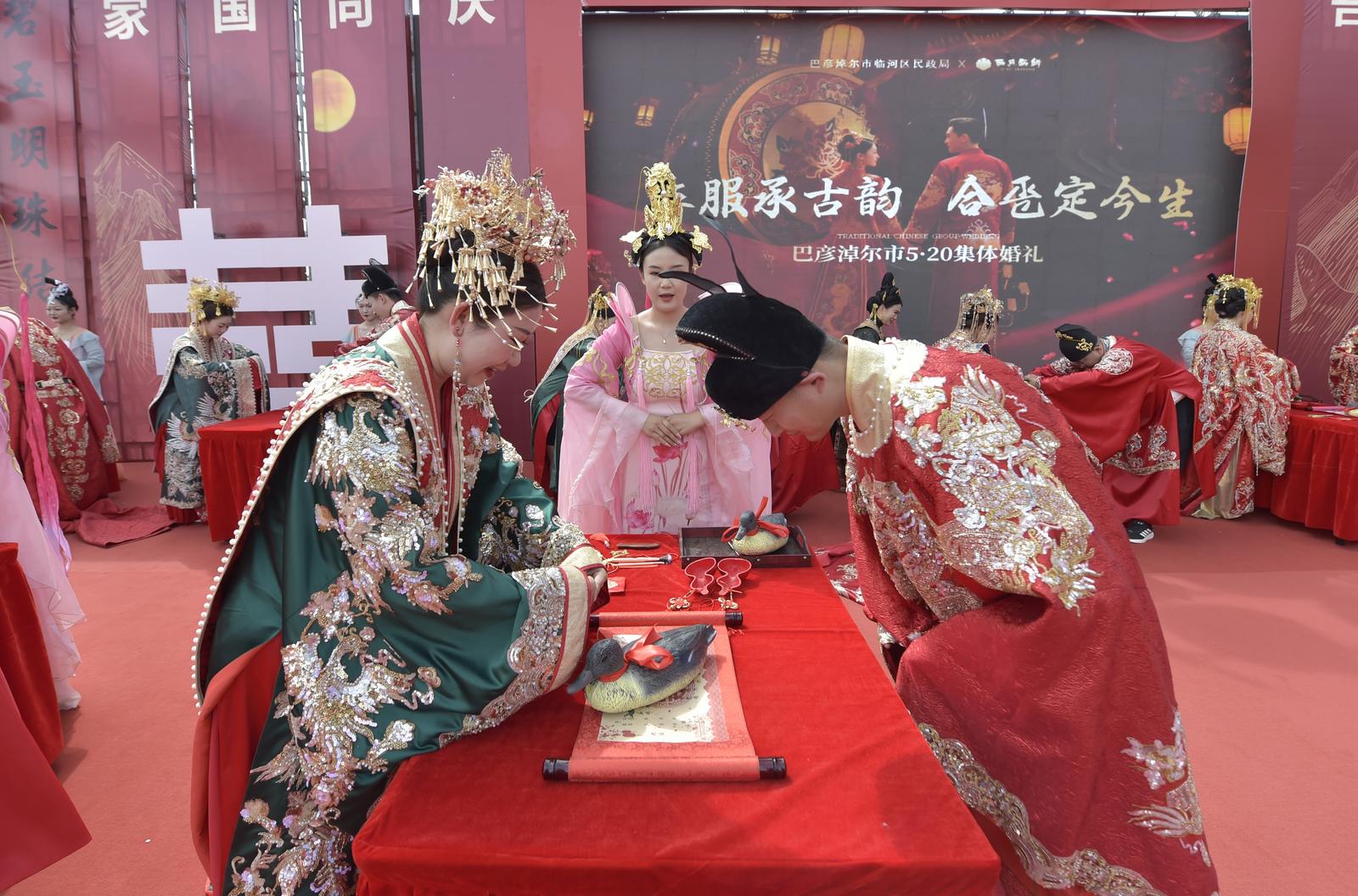 5月20日,临河区黄河湾步行街化身千年礼乐现场,20对新人身着精致的传统婚服,在红绸翻飞、锣鼓喧天中完成了一场跨越时空的婚礼仪式。这场以“幸福联线、爱在巴彦淖尔”为主题的集体婚礼,通过传统仪式的庄重呈现、家风美德的典范引领、文明婚俗的理念倡导,成为我市推进婚俗改革、弘扬传统文化的生动实践。