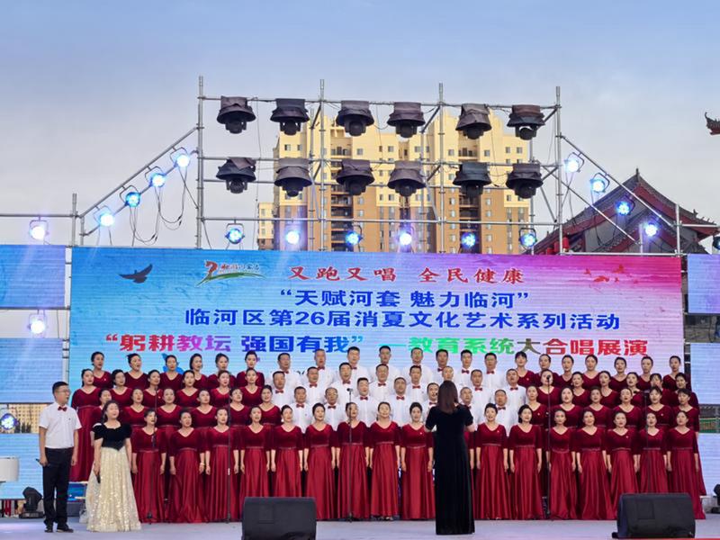 7月1日晚,“天赋河套 魅力临河”临河区第26届消夏文化艺术系列活动“躬耕教坛 强国有我”教育系统大合唱展演在黄河湾步行街精彩上演。