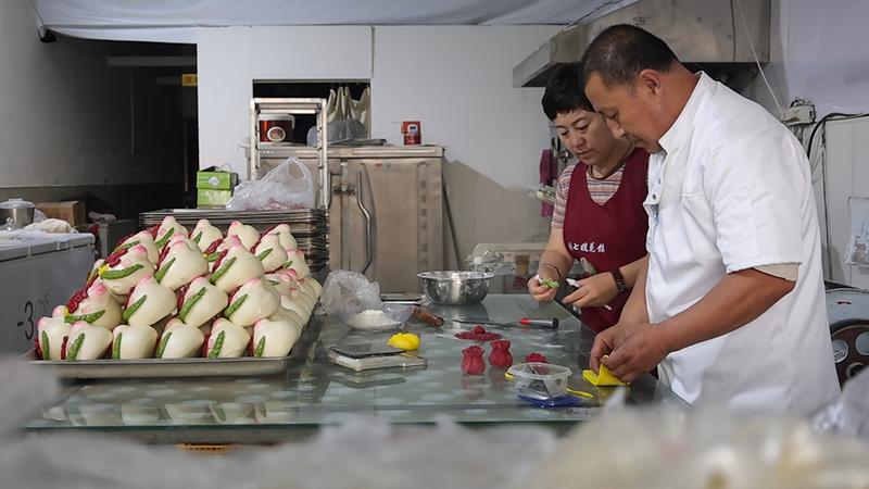只见他们夫妻二人双手灵巧地在面团上翻飞,指间轻捻几下,一团普通的面剂子便有了圆如桃的雏形,接着,更精细的“塑形”开始了:小巧的剪刀张合,快速利落地在面团边缘剪出细密匀称的切口,稍加整理,便是层层叠叠、栩栩如生的花瓣,一根细签灵巧地挑、捏、按,几秒钟便塑造出花朵的立体感和系在福袋上的小绳。“我们现在准备的是顾客预订的寿桃,一共是200个,平时做这个都是现和面现做,这个属于首发面,和好面以后捏好形状等着面醒发好了直接上锅蒸,蒸出来晾好就能给顾客直接带走了。”刘福元说。