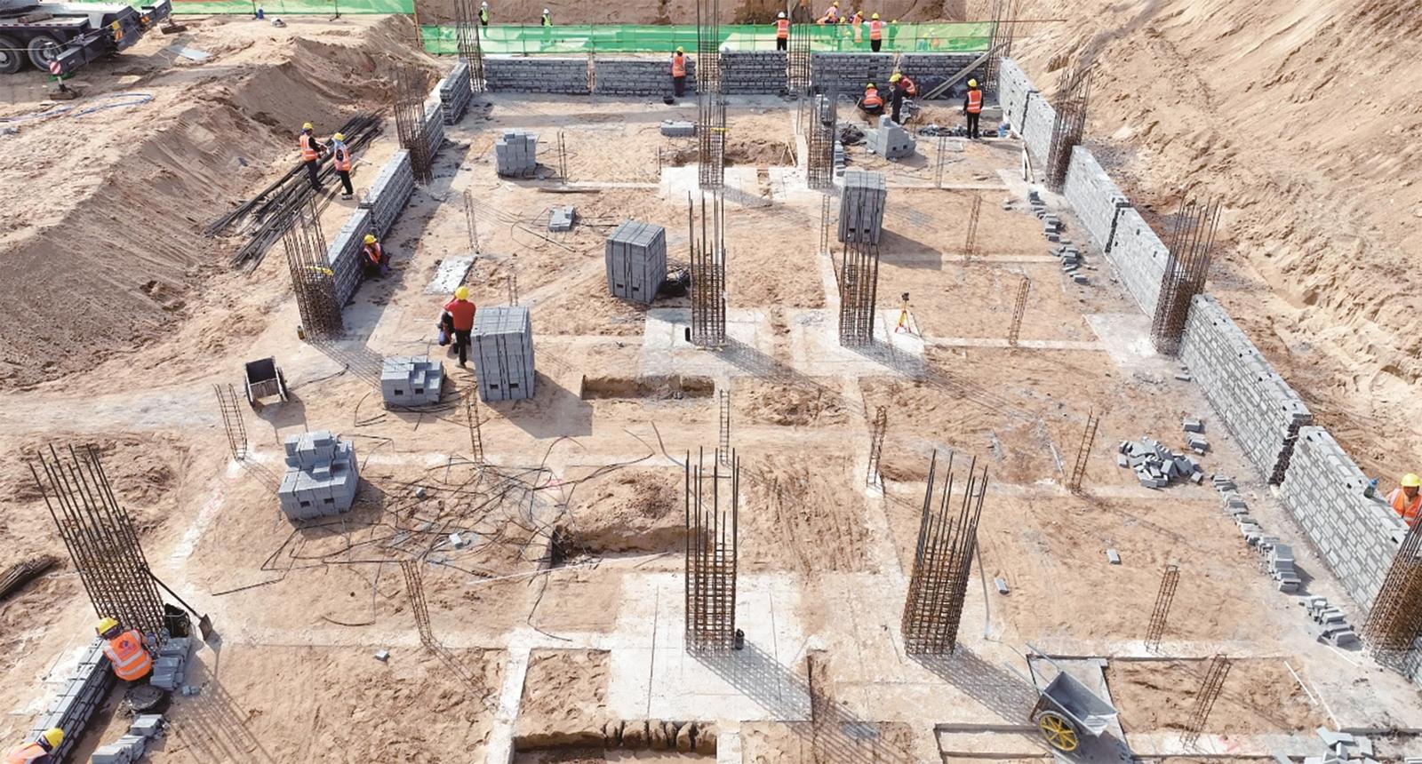来到项目现场,500千伏变电站电网侧储电池仓场地已平整完成,工人们正在进行基础开挖和综合办公楼主体砌筑作业,“目前土方回填已完成,正在做基础开挖,土方工程8月20日完成,设备安装调试8月5日开始,预计今年10月底完成并网。”项目负责人袁平说。
