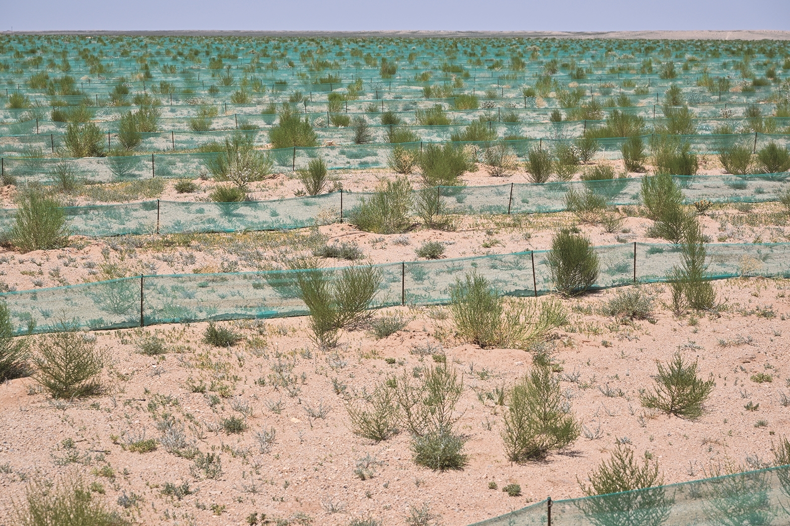 近日,“三北”工程阴山一线生态综合治理项目二标段工程固沙完工。