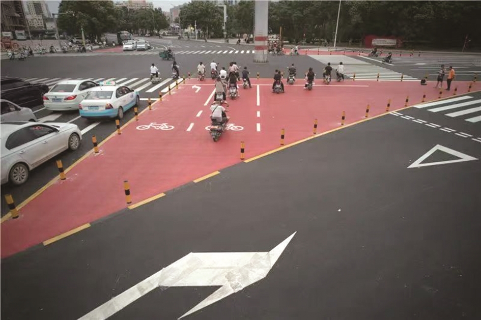 经过实地调研和反复论证,交管部门在该路口设计施划了非机动车行人安全等待区。这一区域通过鲜艳的色彩和物理屏障,为行人和非机动车提供视觉与空间上的双重保护,尤其保障老人、儿童及残障人士的过街安全。