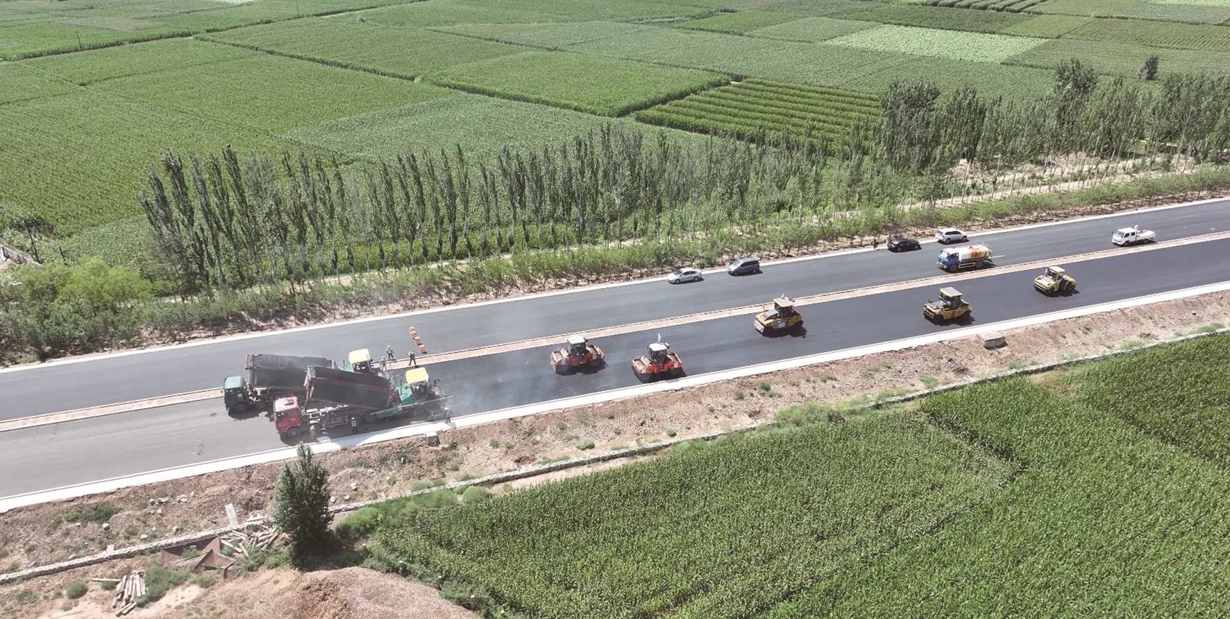 近日,国道110黄羊木头至磴口段公路施工现场机械轰鸣,摊铺机与压路机正在有序进行沥青摊铺作业,施工现场一片繁忙景象。