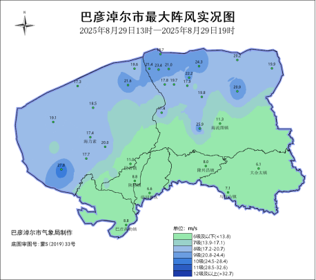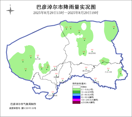 巴市气象台8月29日20时发布降水、大风天气实况通报:29日13时至19时,我市乌拉特中旗大部、乌拉特后旗西部、乌拉特前旗东部出现分散阵雨,最大降水量出现在乌拉特中旗川井苏木3.2毫米;北部风力较大,最大阵风出现在乌拉特后旗本巴图27.8米/秒(10级)。