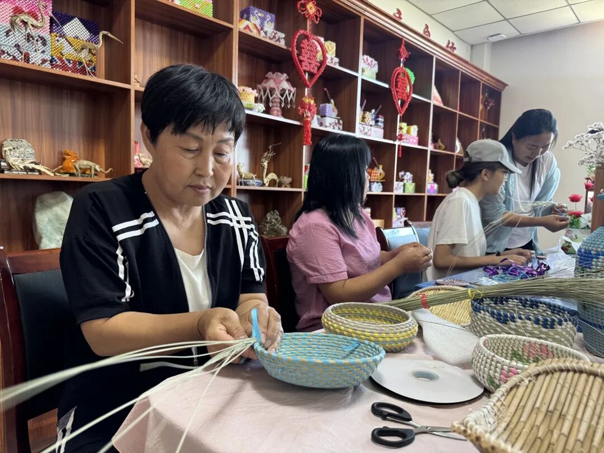 草编技艺工序繁杂,凝聚着先辈智慧,天然材料需经挑选、摘取、整理、浸泡软化等预处理,方能进入编织环节。过程中,挑、压、穿、插等十几种技法按需运用,从简单纹理到复杂图案,每处细节都藏着匠心。那些收纳盒、馒头筐,正是传统实用风格与现代设计融合的例证。“从野地里割回来,阴干或者晒干,编织的时候最开始必须泡,用各种针法和丝带结合起来,完成一个作品。”葛玉英说。