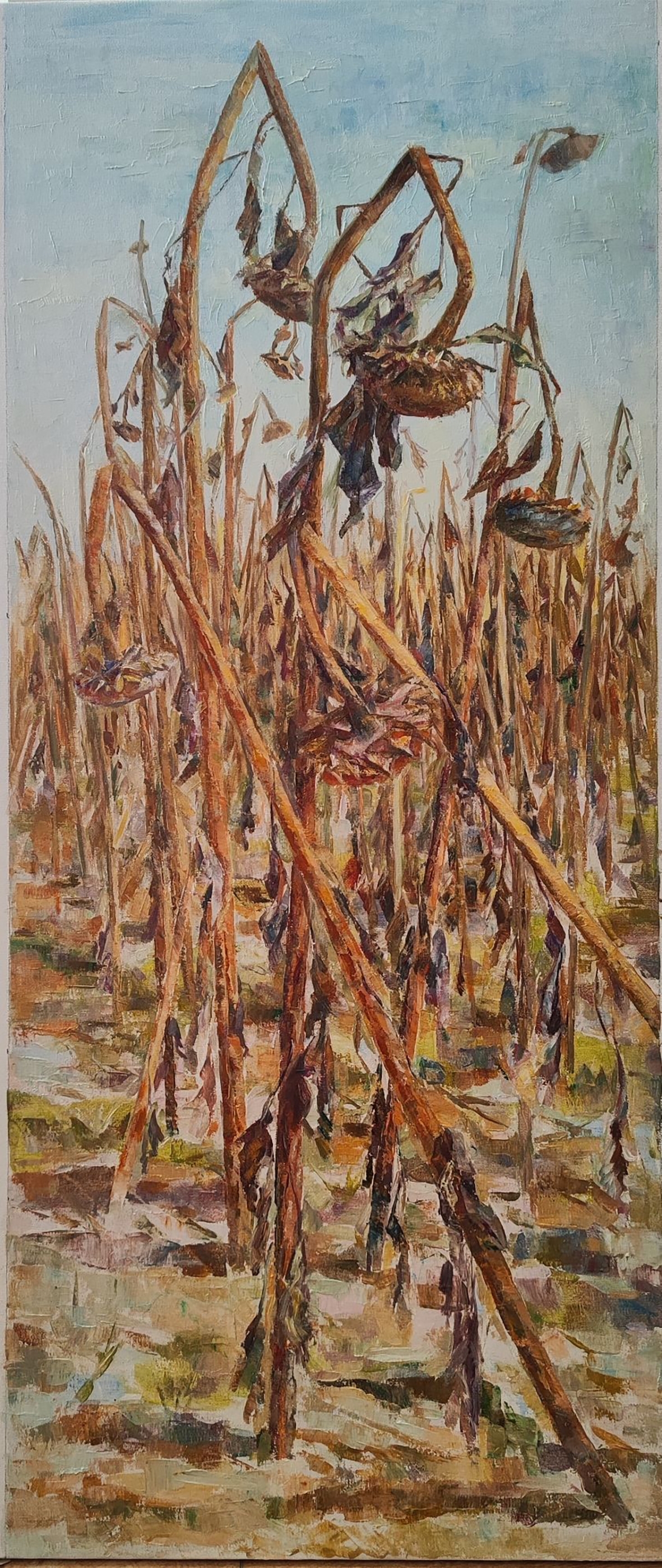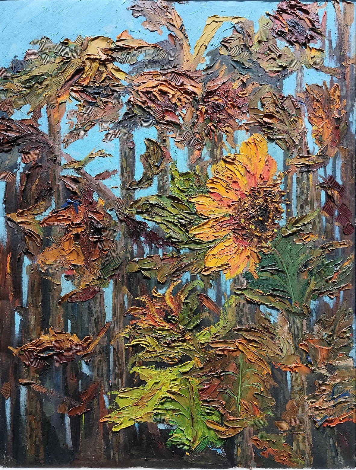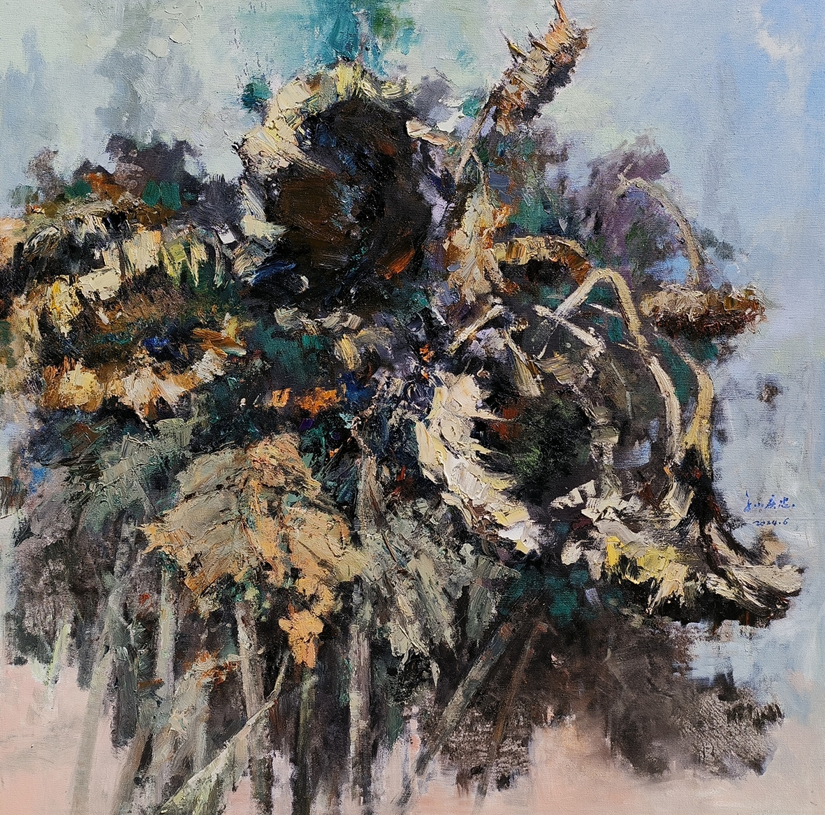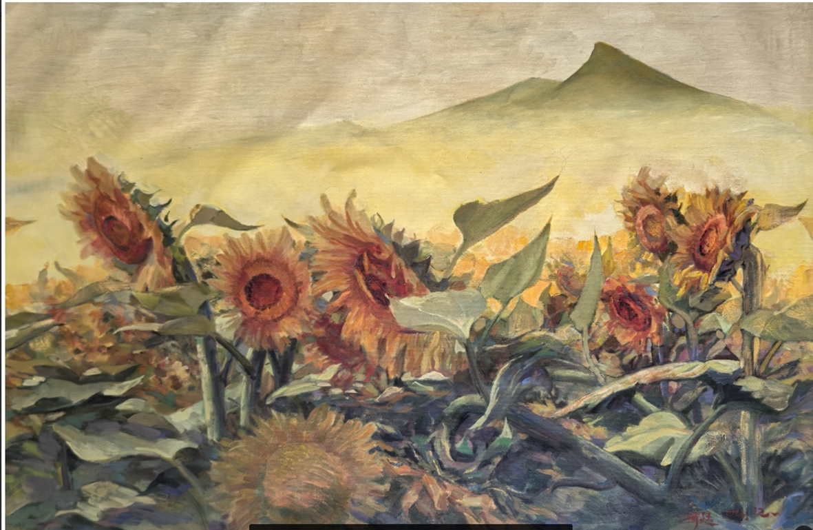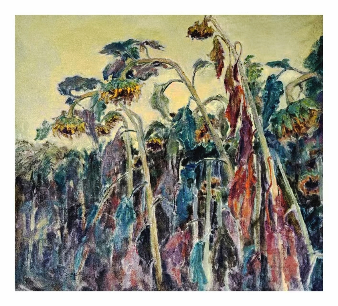 美术馆展厅内,艺术家们在画布上用多元语言解码河套向日葵的生命密码:孙庆忠的油画《向阳花开》,盛放的向日葵流淌着太阳光谱;马晓明的中国画《籽籽相拥心向阳》,成熟的向日葵籽实饱满;张志坚的中国画《向日葵印象》,宛如梵高笔下的向日葵遇见塞尚的色块;王敏的油画《秋日葵韵》,坚韧的葵秆间似有河套朔风穿梭;刘东的纸本丙烯画《河套葵花 共享世界》,展现向日葵走俏互联网……每一幅作品都饱含着艺术家对这片土地深情的礼赞。