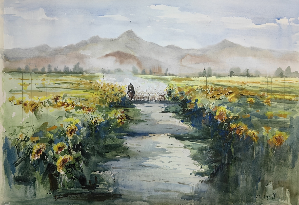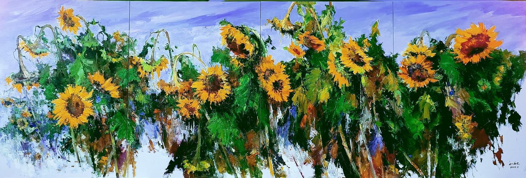 第六届“葵花朵朵向太阳”美术作品巴彦淖尔邀请展展出的82幅作品题材广泛,形式多样,涵盖中国画、油画、版画、水彩画、粉画等多种艺术形式。艺术家们以独特视角、多样技法,将向日葵与巴彦淖尔的历史人文、民俗风情紧密相连。作品或以细腻笔触展现向日葵在阳光下盛放的姿态、或通过大胆用色描绘河套人民丰收时的喜悦场景、或浓墨重彩展现向日葵产业的勃勃生机。