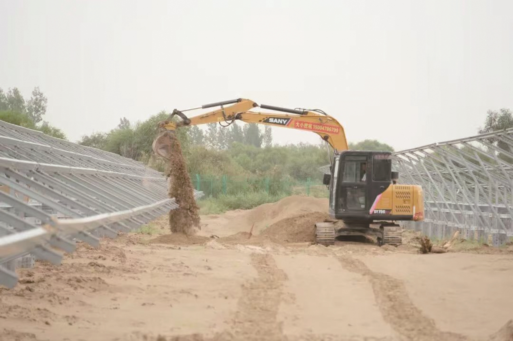 在项目施工现场,整齐的光伏支架间工人们正有序安装光伏板。施工负责人杨建伟介绍,项目自4月25日开工以来进展顺利,目前已全面完成土地平整、围栏及20公里电网线路立杆工程,电气设备与养殖设施正陆续到位。