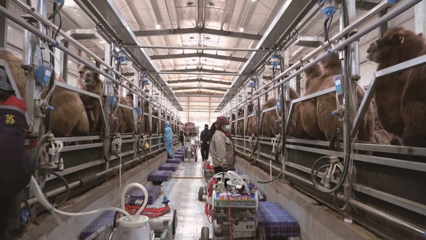 金秋时节,走进乌拉特后旗英格苏万峰红驼养殖基地,标准化骆驼养殖棚圈整齐排列,托养的戈壁红驼个个膘肥体壮。挤奶车间里,母驼有序走到挤奶通道,新鲜的驼奶被缓缓吸入奶罐。在英格苏戈壁红驼产业园区加工车间里,各种驼乳产品源源不断产出。骆驼,这个千百年来游走在丝绸之路上的沙漠之舟,如今正成为乌拉特后旗实现乡村振兴的财富方舟。