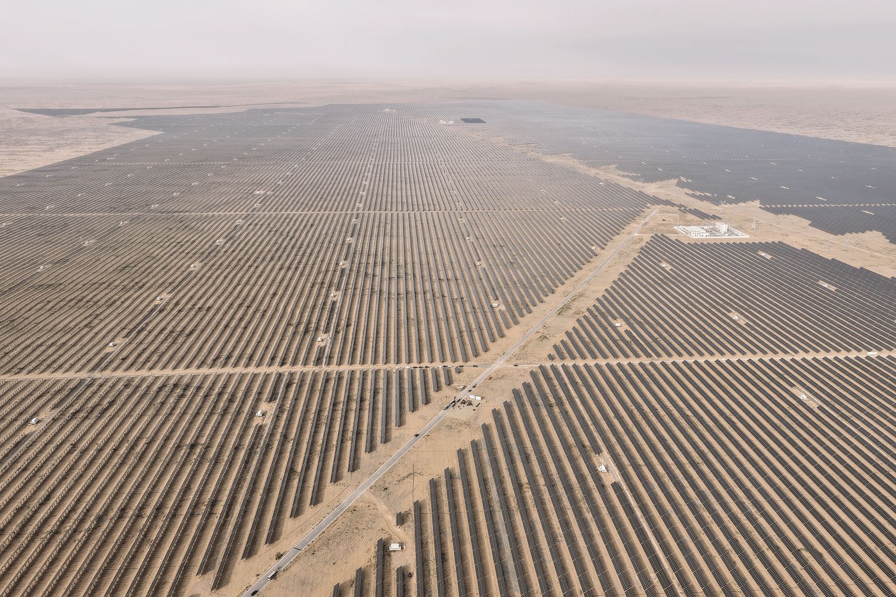 磴口县乌兰布和沙漠深处,昔日黄沙漫卷,如今已是一片“蓝色海洋”。总投资超57亿元的“三北”工程黄河“几字弯”攻坚战治理区200万千瓦光伏+生态治理项目自去年底全容量并网,每年可输送清洁电力约34亿度。该项目创新采用“板上发电、板下种植”模式,在5万亩沙地上同步开展“光伏+梭梭”“光伏+四翅滨藜”生态治理,实现防风固沙、清洁能源生产与沙产业发展多重效益。