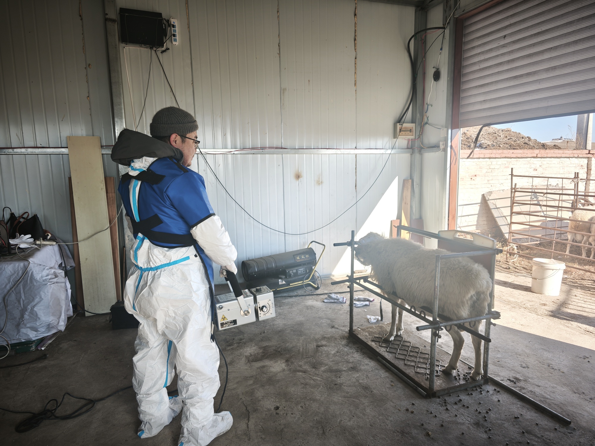 在检测现场,科研人员的操作既严谨又充满“科技感”。一侧的DR检测区里,短尾羊被平稳固定在平台上,设备启动后仅需几秒,电脑屏幕上便清晰呈现出羊的脊椎影像。另一侧的采样区,内蒙古农牧业科学院研究员带领团队为羊抽血,这些血液样本将送往实验室进行基因分析。