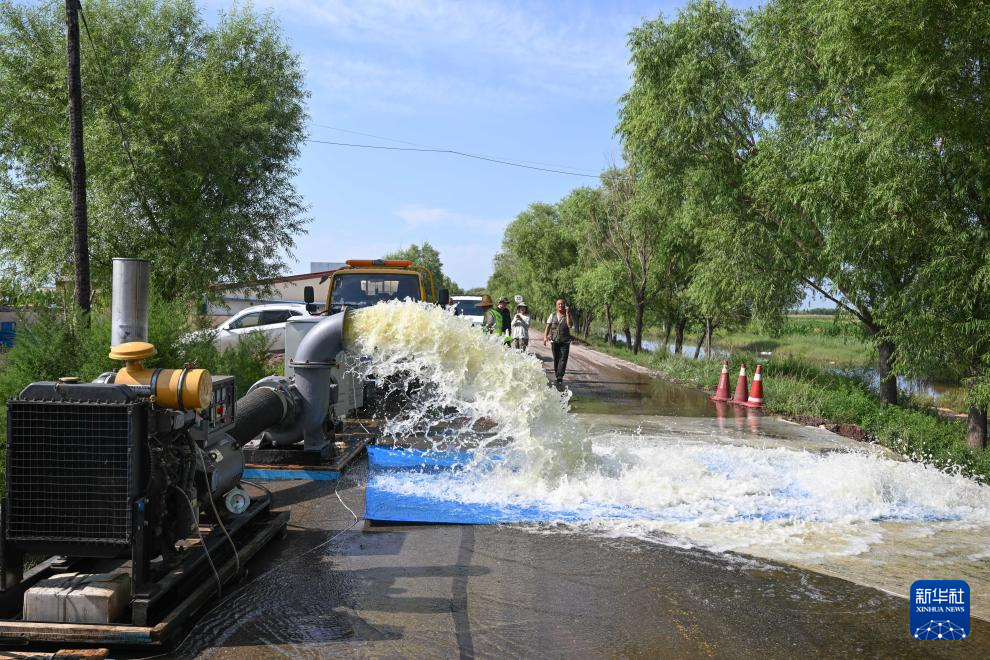 8月1日在内蒙古呼和浩特市土默特左旗一处村庄外,抽水机在排水。