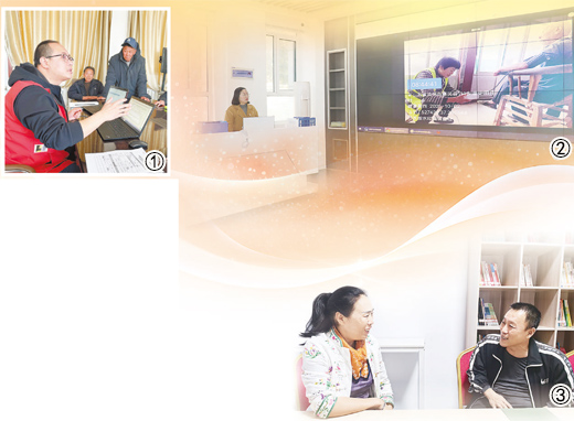 图①:鄂尔多斯凯霖社会工作服务中心社工为救助对象讲解服务类社会救助项目及政策。 郝世奇摄 图②:滨州惠民县民政局工作人员操作“智慧服务监管平台”。 马洪彬摄 图③:李兆义(右)在“如康家园”残疾人之家接受心理辅导。 本报记者 李 蕊摄