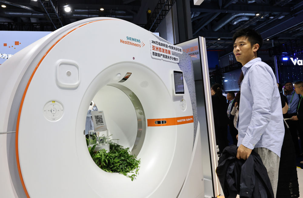 2025年11月6日,参观者在第八届进博会医疗器械及医药保健展区西门子医疗展台驻足观看一款亚洲首发