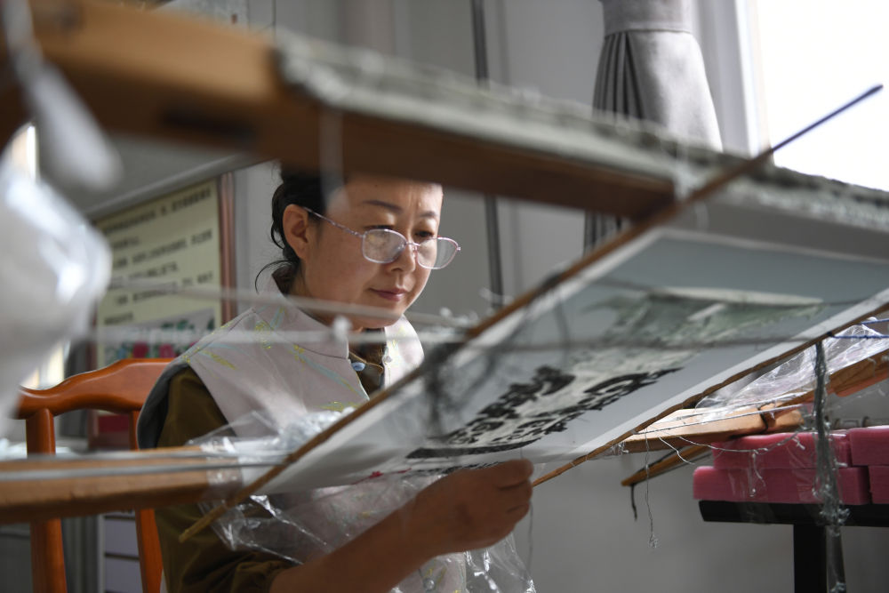 2023年9月8日,陕西千阳绣娘王红燕在西秦刺绣文化产业园内刺绣。陕西千阳县是国家级非物质文化遗产“西秦刺绣”的重要发祥地和传承地。近年来,千阳县将西秦刺绣作为助农增收的重要产业,推动非遗项目产业化发展,助力乡村振兴。