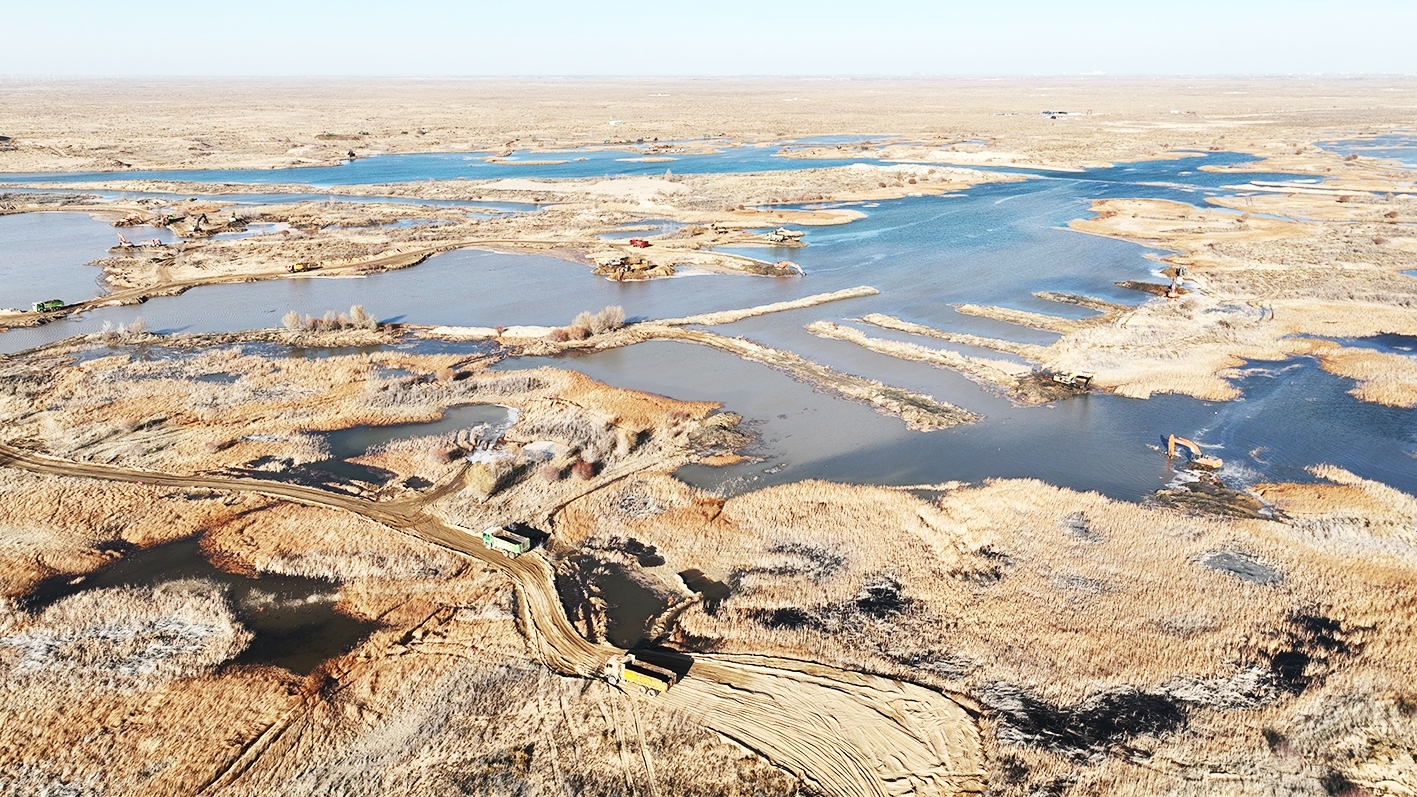 作为黄河凌汛水的应急分洪区,奈伦湖承担着分滞洪水、减轻防洪防凌压力、守护黄河下游安全的关键作用。同时,依托黄河分洪水开展生态建设,实现治理沙漠、改善环境、减少黄沙入黄等效益。今年,磴口县“三北”工程林草湿荒一体化保护修复项目针对奈伦湖0.45万亩淤积严重的湖区实施清淤,其中河道清淤面积280亩,湖区清淤面积4220亩。“项目于11月7日开工建设,共租赁本地机械200余台,日清淤量3万余方。截至目前,已清淤20余方,计划于12月份完工。”磴口县城镇发展投资有限公司总经理张宇说。